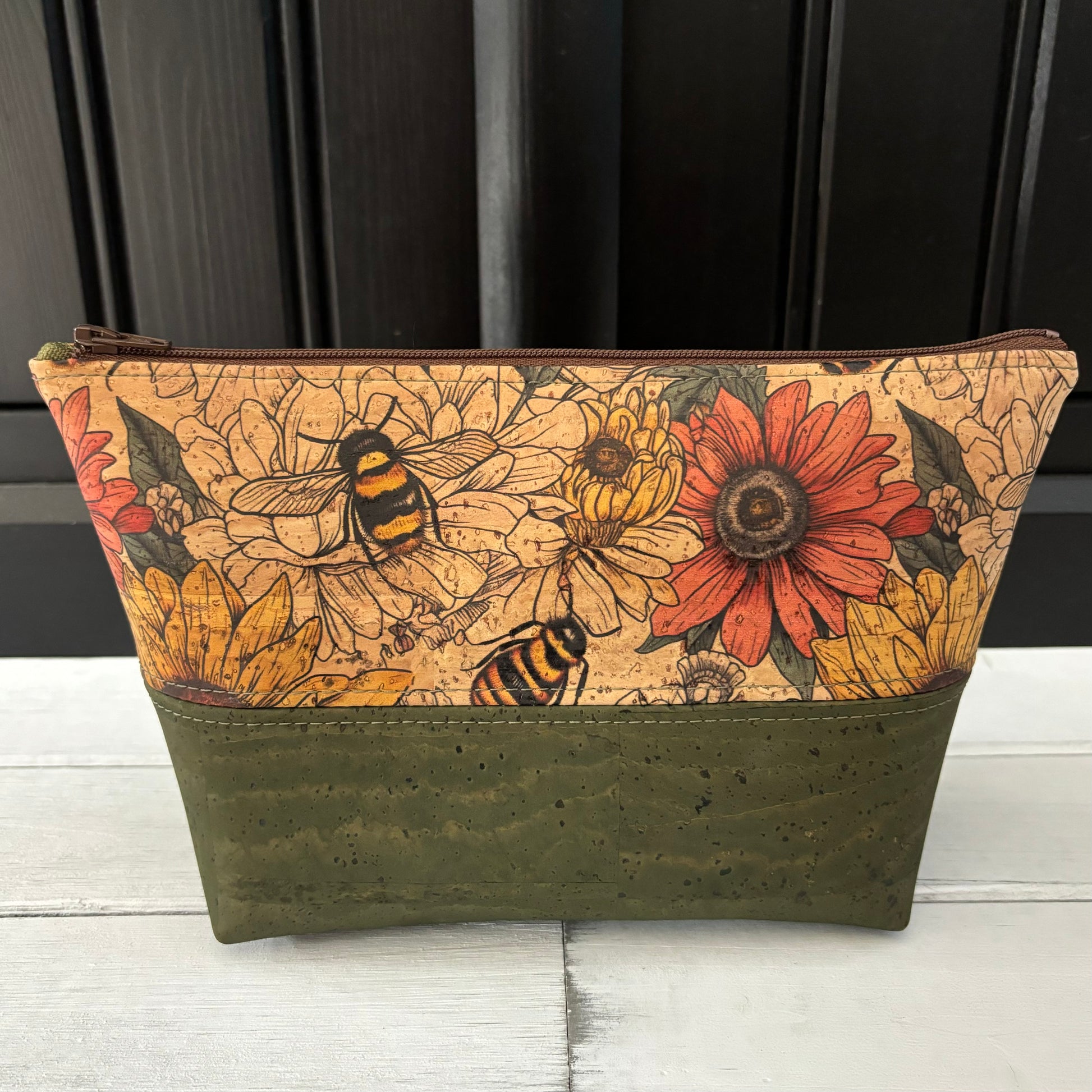 Open Wide Pouch - Small - Bees and Army Green Cork