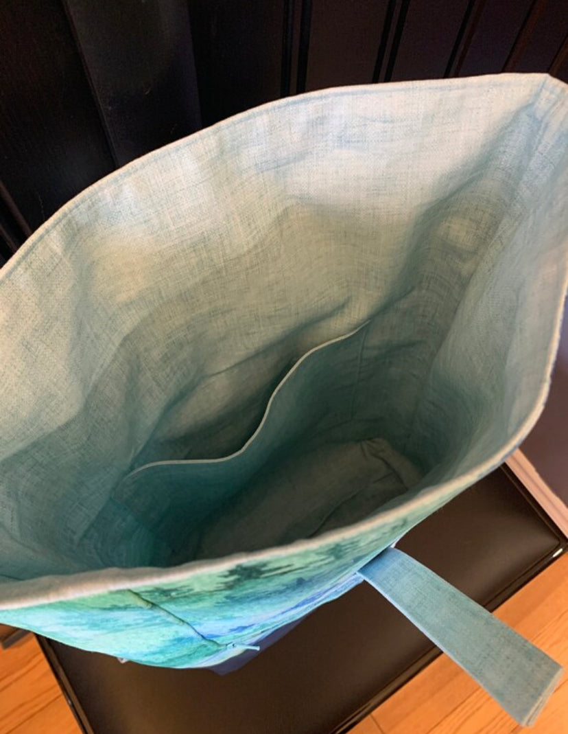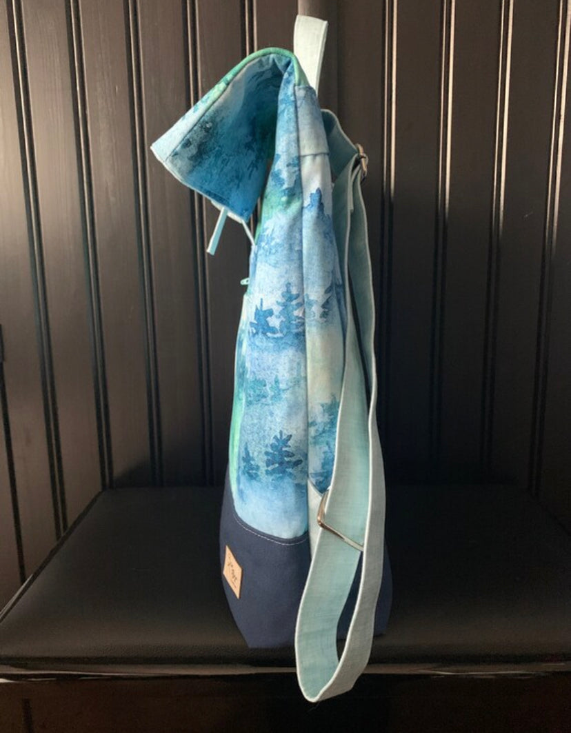Beautiful canvas backpack in watercolour trees print with blue canvas accent on the bottom. Interior fabric is a blue cotton print.
